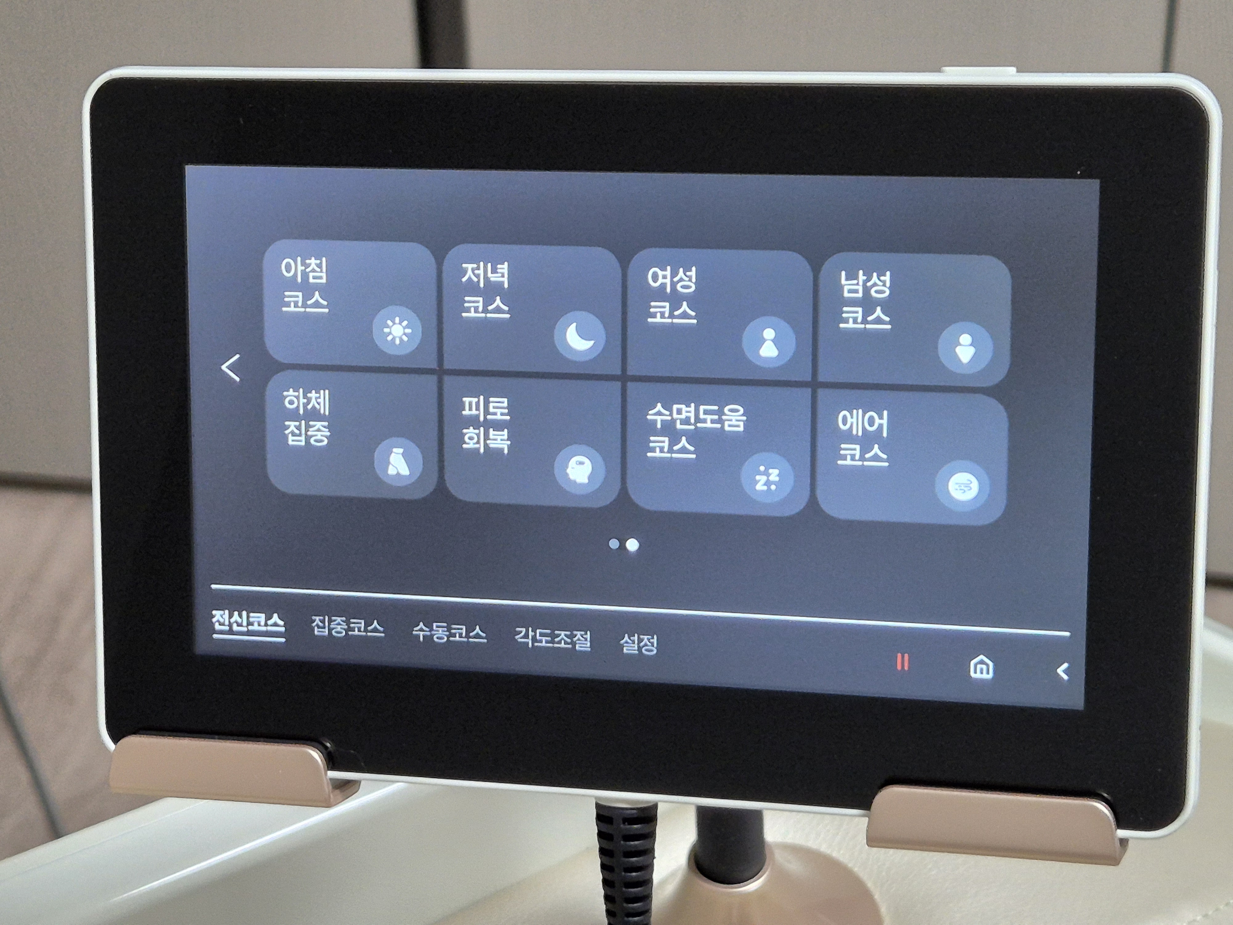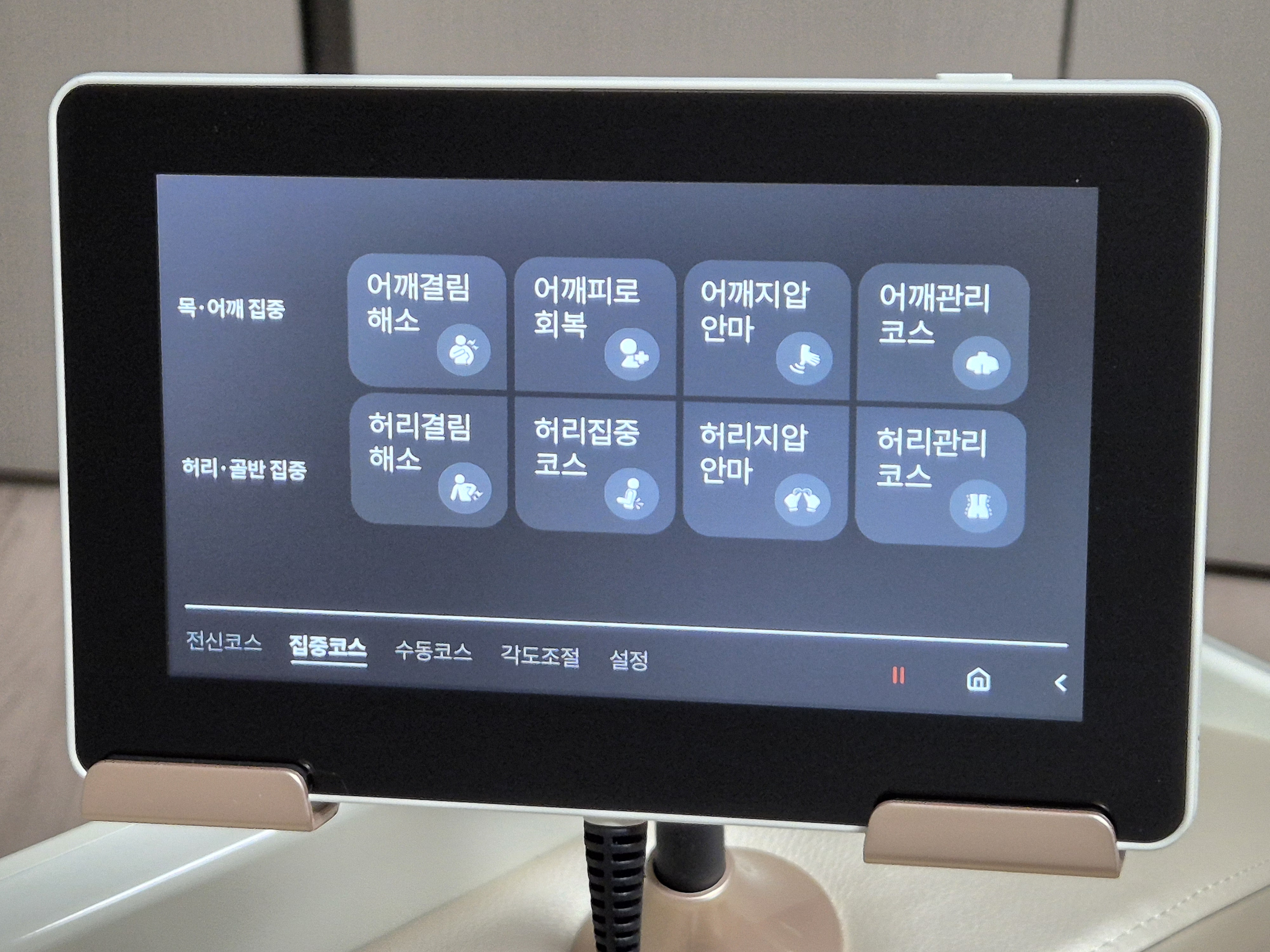 맨 처음 안마의자 실행하면 나오는 메뉴 직관적이라 쉽게 작동시킬 수 있다.
